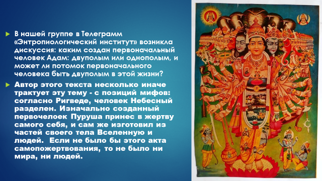 u В нашей группе в Телеграмм «Энтропиологический институт» https://t.me/theoryininvolution возникла дискуссия: каким создан первоначальный человек Адам: двуполым или однополым, и может ли потомок первоначального человека быть двуполым в этой жизни? u Автор этого текста несколько иначе трактует эту тему - с позиций мифов: согласно Ригведе, человек Небесный разделен. Изначально созданный первочелоек Пуруша принес в жертву самого себя, и сам же изготовил из частей своего тела Вселенную и людей. Если не было бы этого акта самопожертвования, то не было ни мира, ни людей. u Тема изначальной двуполости может также быть осмыслена и с позиции физиологии: две половые системы в зачатке присутствуют у инфантильного 8 недельного эмбриона, но развивается только одна, согласно кариотипу - мужскому или женскому. Если бы был возможен истинный гермафродитизм у людей, то исчезло бы стремление к противоположному полу, а это бы привело человека к гибели. Это противоречило бы плану создателя. u Может б