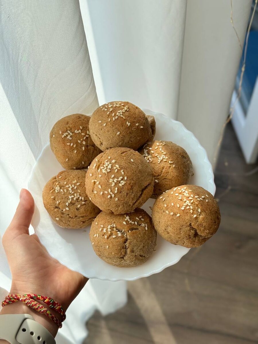 На правах рекламы хочу напомнить, что у меня так же есть и мой Телеграмм, там всегда много интересных и свежих статей о здоровье. И не забывай подписаться на мой Дзен и поставить лайк :) Зеленая гречка - 100 гр Кабачок - 1 шт Псиллиум - 1-2 ст.л. Рисовая мука - делала на глаз, около 100 гр Разрыхлитель теста Любые специи: соль, сухой чеснок, паприка, черный перец Для смазывания использовала масло авокадо и посыпала кунжутом сверху Зеленую гречку промываем и замачиваем в чистой воде примерно на 2-3 часа. Кабачок очищаем от кожуры, нарезаем кубиками и взбиваем в блендере вместе с гречкой. В получившееся тесто добавляем разрыхлитель и все специи. Все тщательно перемешиваем. Далее добавляем псиллиум и оставляем тесто на 10 минут. После чего добавляем рисовую муку. Я делала на глаз. Вам нужно довести тесто до такого состояния, когда вы сможете слепить булочки. Далее формируем булочки, смазываем сверху чуть маслом, посыпаем кунжутом и ставим в разогретую до 180 градусов духовку на 35 минут.