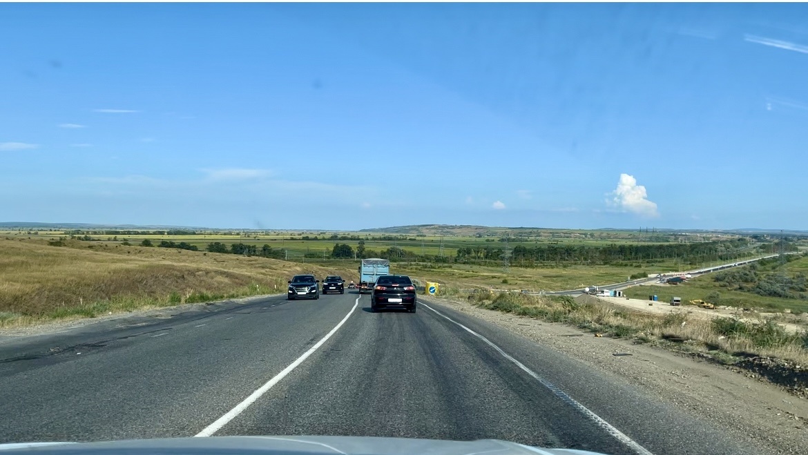 … Отдыхаем от серпантина, дышим горным воздухом, наслаждаемся видами и едем дальше. Очень хотелось на стоянке увидеть миндальное дерево с плодами, но кроме дубов с желудями ничего не было. Если в первой части ЮБК дорога была с высоченными графитовыми скалами, то вторая её часть была с менее высокими скалами жёлтого и серого цветов, в виде пирамидок. Дорога продолжала вилять, уходила то в материк, то шла вдоль моря. Появилось много мотоциклистов. Один причудливее другого. Виды обворожительные, захватывающие, просто нереальные, сумашедшей красоты! …В Коктебеле мы остановились на обед. На часах было 14:00. Вкусная незамысловатая еда. Зашли одни, все столики пустые, даже засомневались, а выходили, все столы заняты и очередь до кассы). …Дальше пошли степи, горы стали отодвигаться все дальше и дальше. Появились интересные хуторки с ровными дворами, ровными огородами и огромными просторами. …К Крымскому мосту мы подъехали в 16:30, ровно в тоже время, как и заезжали.