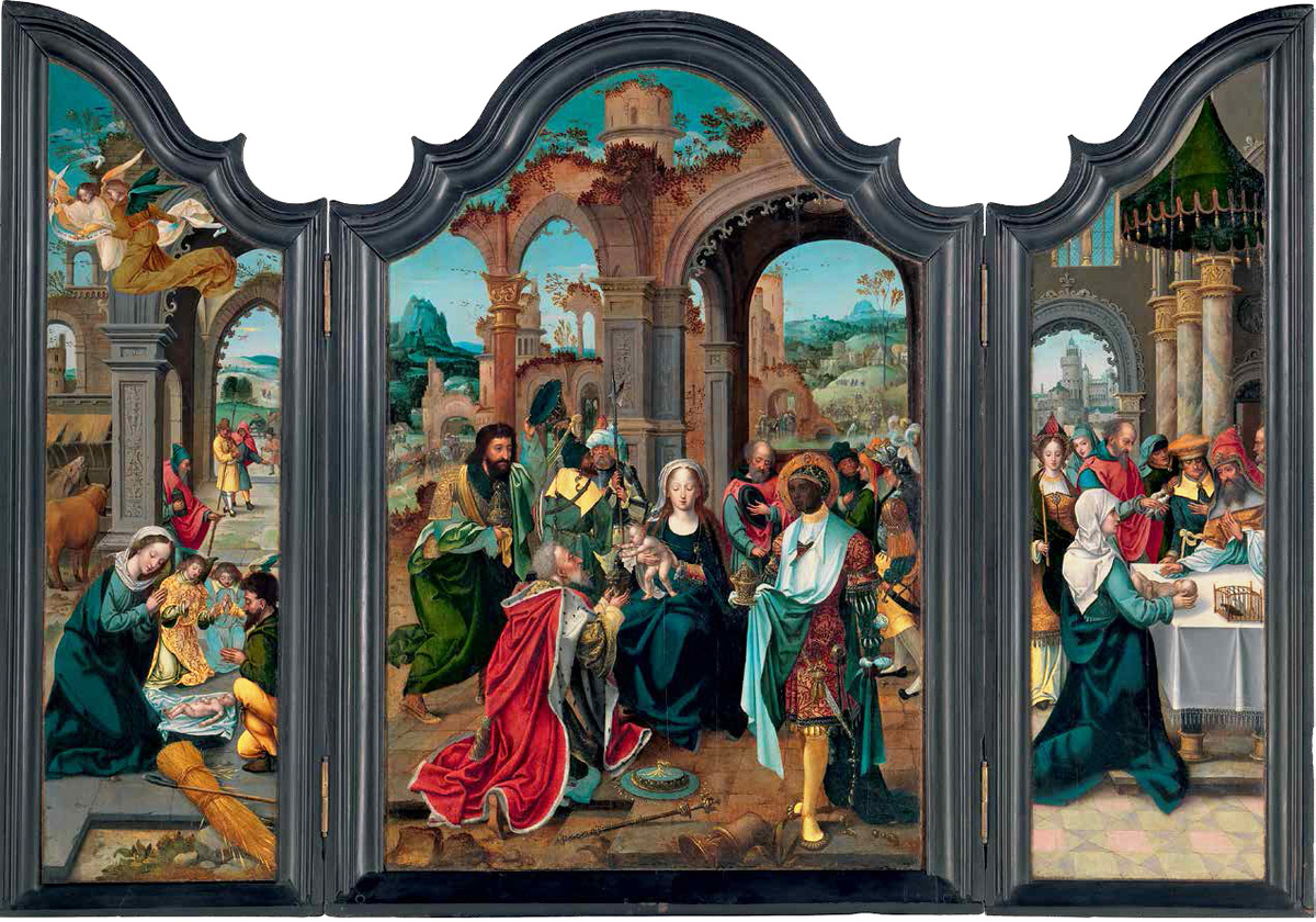 Экономическое процветание Антверпена в начале шестнадцатого века привело к расцвету искусств в нём. Возросло и производство относительно небольших и средних по размеру религиозных картин, которые создавались специально для продажи на открытом рынке группой художников, известных как антверпенские маньеристы. Как отмечает искусствовед Дэн Юинг: Поклонение волхвов — это определяющая тема живописи антверпенского маньеризма, её фирменная иконография... Тема волхвов, сочетающая в себе экзотику, высокую моду и очарование богатства, была микрокосмосом маньеристов. Кроме того, эта тема была отражением ведущей профессии растущей буржуазии Антверпена, её иконография идеально сочеталась с образом жизни, посвященным торговым путешествиям на дальние расстояния. Представленный триптих «Поклонение волхвов» отличает превосходное качество исполнения и замечательная сохранность. Прекрасная палитра глубоких насыщенных красных, синих, зелёных и жёлтых тонов и тщательное внимание к деталям мерцающей парчи