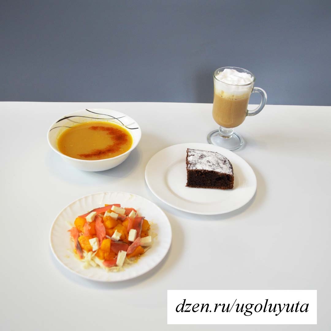 Я люблю тыкву, поэтому недавно готовила яркий и вкусный тыквенный обед. Четыре блюда (суп, сытный салат, напиток и десерт) из одной тыквы. 1 лук 1 морковь 300гр тыквы 150гр чечевицы Лук и морковь мелко нарезать, обжарить. Залить водой, добавить нарезанную тыкву и чечевицу. Варить около 30-40 минут (до мягкости тыквы и готовности чечевицы). Пробить блендером, посолить и поперчить. Варить еще раз до закипания плюс пару минут. 200гр тыквы 100гр слабосоленой красной рыбы 100гр листьев салата (или пекинской капусты) 50гр брынзы или феты 1 небольшая красная луковица 1 зубчик чеснока 2 ст.л. соевого соус Смесь прованских трав Тыкву нарезать на кубики, чеснок измельчить. Тыкву и чеснок залить соевым соусом, посыпать прованскими травами, дать постоять. Затем выложить на сковороду и обжарить до мягкости тыквы. На тарелку выложить листья салата, готовую тыкву, нарезанный полукольцами лук, рыбу и сыр. Полить лимонным соком 200гр тыквы 200мл молока Специи Сахар Кофе Тыкву нарезать на куб