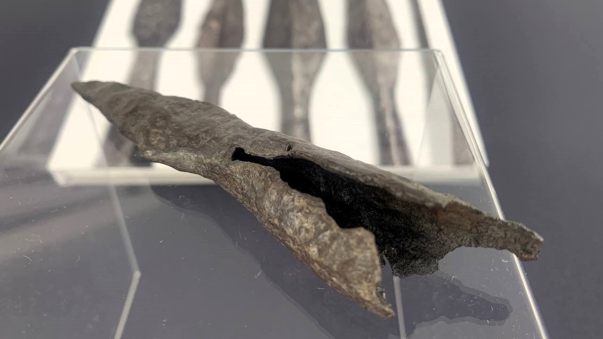 – Вток – это металлический элемент копья, который насаживался на тыльную часть древка оружия, позволяя втыкать его в землю. Вток служил упором и помогал воинам в бою. Железные черешковые наконечники стрел уже представлены в коллекции реликвий. Один из них относится к типу бронебойных и имеет массивное перо ромбического сечения с упором. Другой наконечник – овально-удлинённой формы пера с утратами, – пояснил Евгений Столяров.