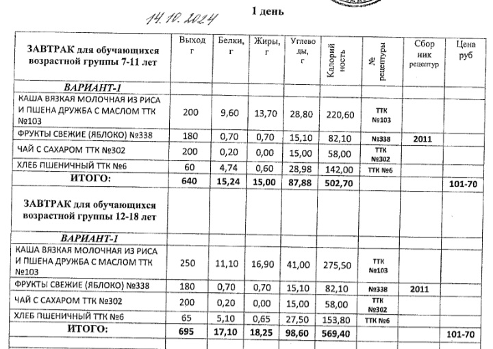 Меню из школьной столовой - 2024. Завтраки и обеды для обучающихся 7-11 и 12-18 лет, КБЖУ и цена (ч. 1)