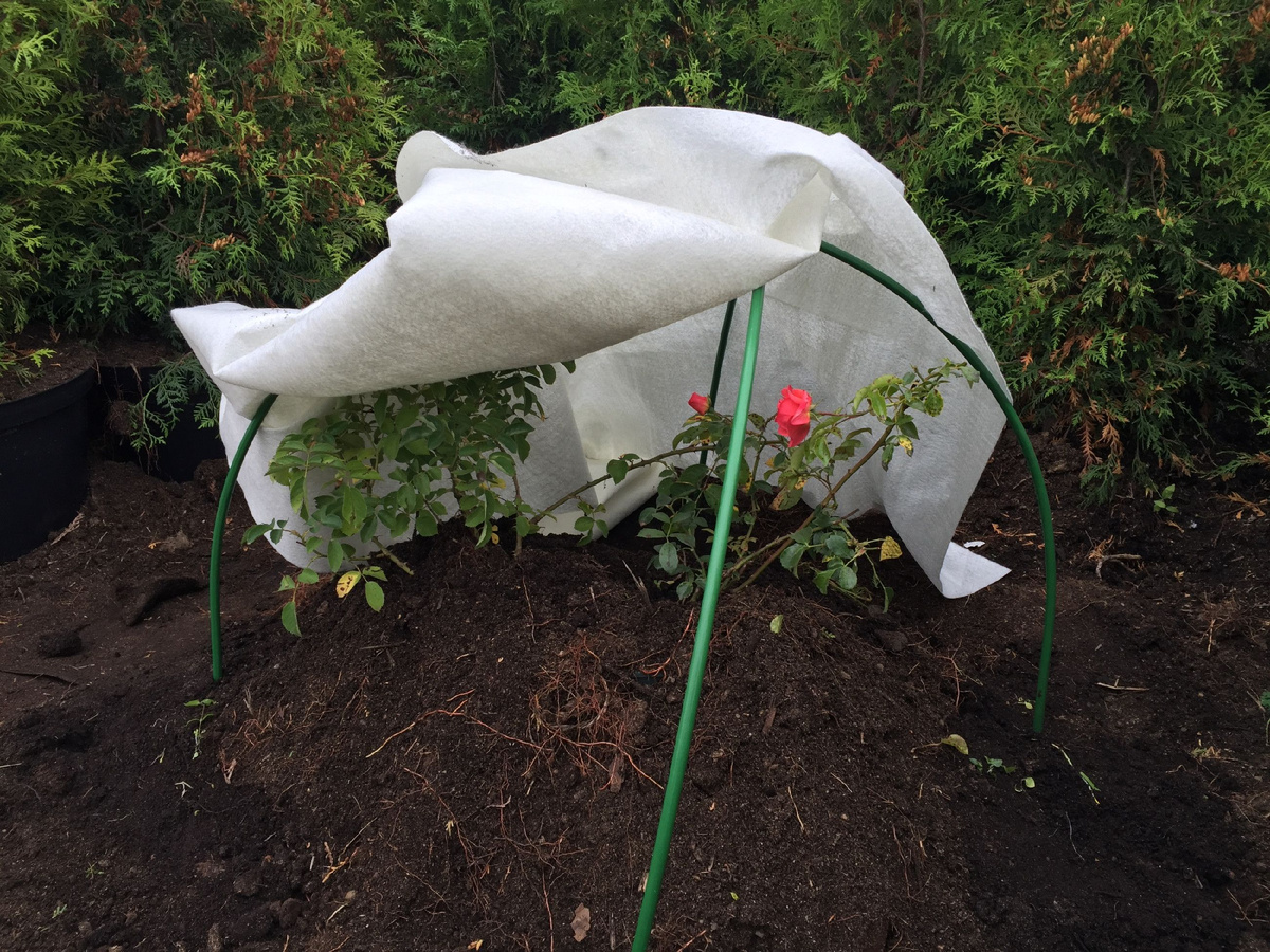 Штамбовые розы достаточно укрыть спанбондом или мешковиной, а оставшиеся после обрезки стебли роз флорибунда следует присыпать торфом или землёй.