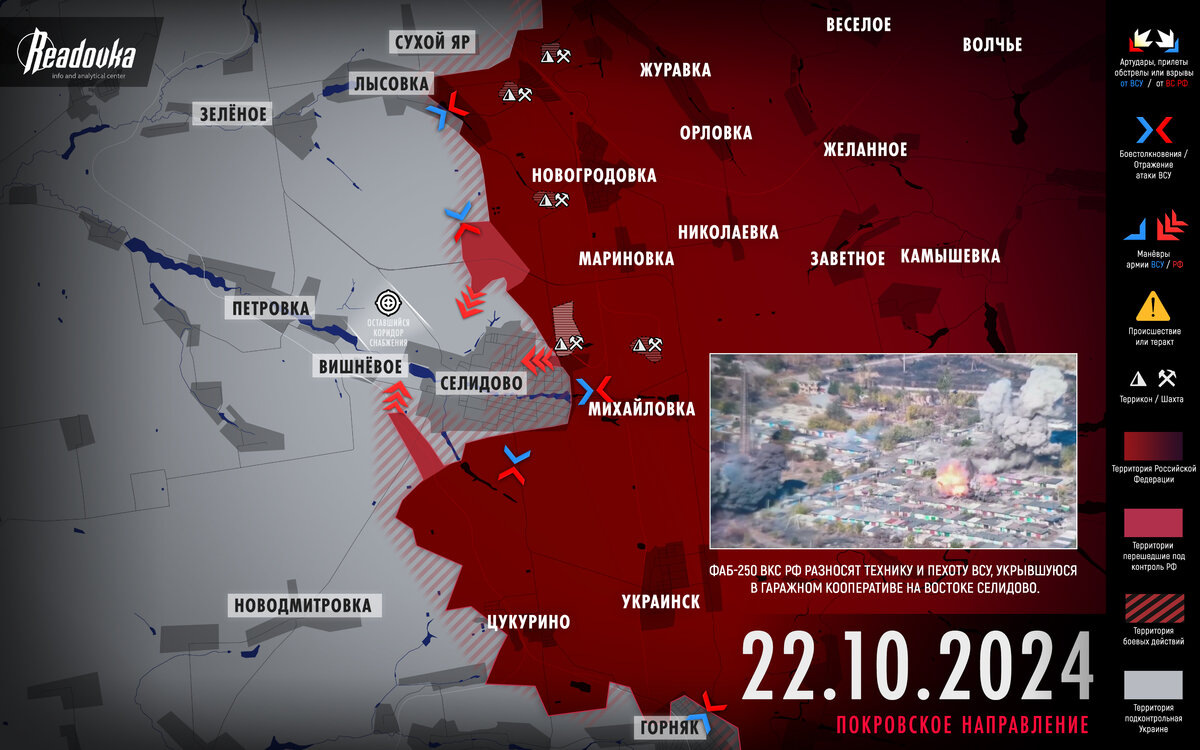 Редакция Readovka собрала самые важные события за 22 октября в разрезе СВО. Русские войска завершили операцию по перерезанию основных логистических артерий Селидово и приступили к прямым действиям против гарнизона города. Глава Министерства обороны Франции Лекорню призвал начать обсуждать размещение на Украине средств «неядерного сдерживания» после окончания боевых действий. Японское издание Nikkei предположило, что страны «семерки» не собираются размораживать российские активы даже после завершения конфликта на Украине..