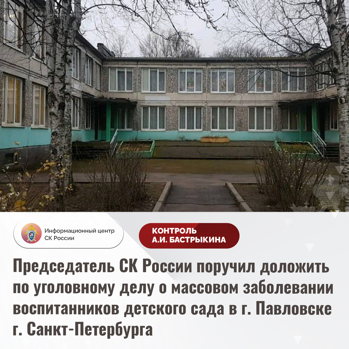 Председатель СК России поручил доложить по уголовному делу о массовом заболевании воспитанников детского сада в г. Павловске г. Санкт-Петербурга В СМИ и социальной сети сообщается о массовом распространении среди воспитанников детского сада в городе Павловске города Санкт-Петербурга инфекционного заболевания. С октября текущего года у малолетних регулярно выявляются симптомы кишечного отравления, при обращении в медицинские учреждения у них диагностирован сальмонеллез. Всего из указанного учреждения за помощью обратились 17 человек. В ГСУ СК России по городу Санкт-Петербургу по данному факту возбуждено уголовное дело. Председатель Следственного комитета Российской Федерации Александр Иванович Бастрыкин поручил и.о. руководителя ГСУ СК России по городу Санкт-Петербургу Олегу Валерьевичу Бобкову доложить о ходе и результатах расследования уголовного дела, поставив его на контроль в центральном аппарате ведомства. #СледственныйКомитет #СКРоссии #СКР #ИЦСКР #ИнформационныйЦентр #АлександрБ