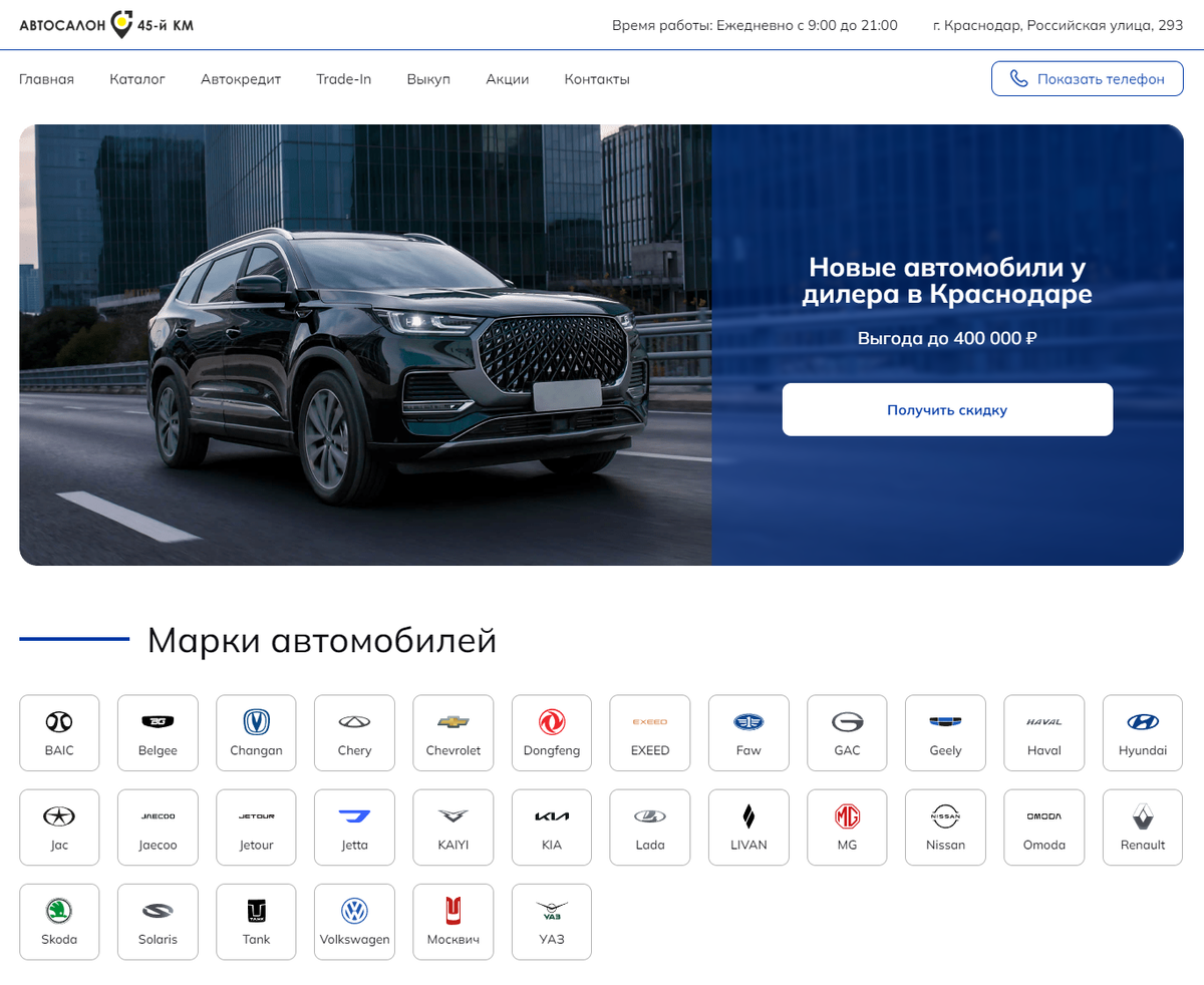 Приветствуем всех, кто ищет новые автомобили по выгодным ценам! Автосалон с нетипичным названием «45-й км» обратил на себя наше внимание. Всё дело в том, что данный автоцентр привлёк к себе интерес не только своим названием, но и низкими ценами на автомобили. Автосалон «45-й км» находится в Краснодаре на Российской улице, 293. Автосалон позиционирует себя как надёжного дилера новых автомобилей, который уже 15 лет находится на авторынке. На сайте автоцентра заявлено, что дилер работает с 30-ю автомобильными брендами, естественно, большинство из них авто-бренды из Китая. На сайте автосалона также отдельно выделены банки партнёры. Представлены все крупнейшие банки Российской Федерации, что, безусловно, внушает доверие у потенциальных клиентов «45-го км». Еще больше об этом автосалоне читайте на сайте! На сайте автоцентра представлены различные услуги, которые оказывает автосалон, а также акции и скидки. Например, автосалон утверждает, что с 90% вероятностью вам будет одобрен кредит на авт