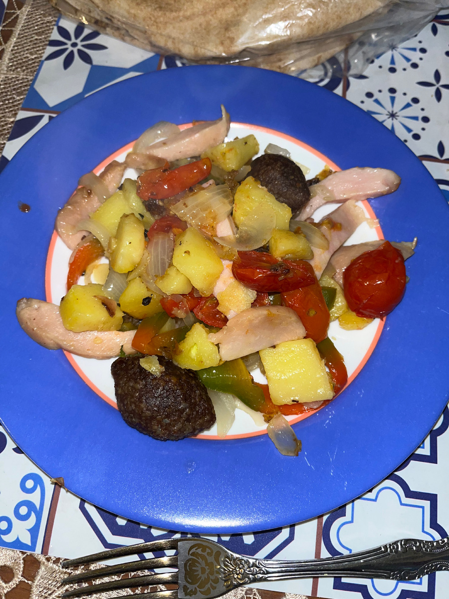 Всем добрый вечер! Решила на скорую руку ужин приготовить. Из серии, что есть в печи на стол мечи ! Или что Бог послал ! Бог в этот вечер послал совсем не много, остатки отварной картошки и мясные шарики в количестве двух 😃 Пришлось на ходу изобретать ! Мы вообще не ужинаем, у нас поздний обед, поэтому довольствуемся парой бутербродов и чай, кофе на выбор! А тут что-то захотелось чего-то посытнее, наверное похолодало! Температура чуть упала, мы в горах, 600 метров над уровнем моря, всё таки не шутка ! И хотя мне до Бейрута 15 минут езды без пробок, погода у нас отличается на несколько градусов! Вчера нас понесло в мол рядом с Дахией, там где обстрелы🤷♀️ так вот там температура вечером была +28 , а у нас +19 ! Солидная разница! И в моле , как при ковиде, в 7 часов уже некоторые магазины были закрыты, мы быстренько купили то, что нужно и домой! Очень не комфортная ситуация. Отвлеклась я от приготовления ужина 😃 В общем, достала я луковицу, порезала слайсами, отрезала кусочек