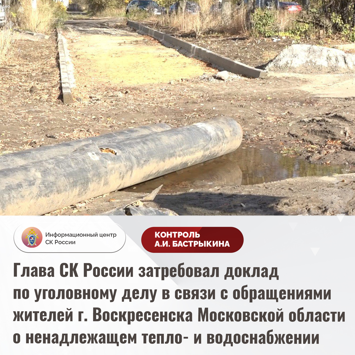 Глава СК России затребовал доклад по уголовному делу в связи с обращениями жителей г. Воскресенска Московской области о ненадлежащем тепло- и водоснабжении К Председателю СК России А.И. Бастрыкину через Информационный центр обратились жители города Воскресенска Московской области по вопросу нарушения их прав. Несмотря на начало отопительного сезона, до настоящего времени в жилые дома, социальные и образовательные учреждения в микрорайоне Лопатинском теплоснабжение не подается, в связи с чем в помещениях нарушен температурный режим. При этом холодное водоснабжение поступает в здания с регулярными перебоями, качество воды не отвечает требованиям безопасности из-за значительного износа инженерных систем и превышения уровня железа. Указанная ситуация освещается в социальной сети. В ГСУ СК России по Московской области по данному факту возбуждено уголовное дело. Председатель Следственного комитета Российской Федерации Александр Иванович Бастрыкин затребовал у и.о. руководителя ГСУ СК России