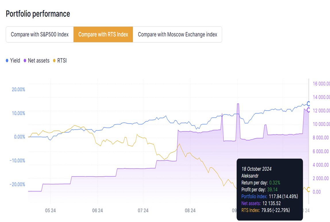С нуля до 12 135$ - реальный пример инвестиций Как вы знаете (а может и не знаете, друзья) - у меня есть счет у брокера FF, где я отрабатываю методики пополнений, работы с альтернативным брокером для россиян. А еще: формирую капитал "для всякого". И вот с апреля 2024 года по октябрь - по сути с нуля - я сформировал более 12 тысяч долларов капитала. Но интересно еще и другое: 🔥1) Неплохая доходность: за полгода почти 14.5% в долларах 🔥2) Отличная защита: инвестиции в валюте, в надежные активы 🔥3) Диверсификация: пока индекс RTS (долларовое выражение рынка РФ) просел на 23%, мой портфель вырос! Нужна консультация или портфель из надежных дивидендных акций? Обращайтесь, помогу: ✅ https://t.me/knyazevinvest_1 и aleksandr@knyazevinvest.ru