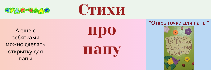 Подобрала для вас стихи про папу: короткие и добрые. Их можно использовать и как поздравления в открыточке с днем рождения, а день отца или на 23 февраля. И еще у меня есть оригинальная поделка-открытка для папы на день рождения-сделайте, получается красиво! Она вот тут: https://vk.com/chudochado-Открытка для папы Папа, если хочет, может песню спеть,