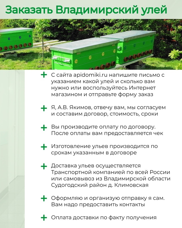 - Вы оплачиваете стоимость заказ по договору. Я высылаю вам чек с сайта Налог.ру. При наличии на складе нужных вам ульев, отправляю в течение недели