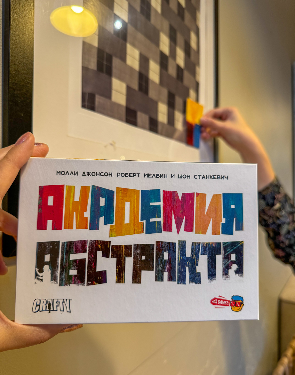 Недавно опробовала свеженький в плане локализации филлер «Академия абстракта» — я, как только увидела коробочку, мгновенно растаяла, разумеется: люблю игры про искусство и очень радуюсь, что в последнее время их выходит всё больше. ПРАВИЛА В игре всего три раунда, и вы в качестве студентов пытаетесь за это время завоевать доверие преподавателей живописи, выполняя их задания. На каждый раунд у вас будут цели, по которым вы будете набирать очки. Когда-то это будут карточки вдохновения рисовать в определённом стиле, когда-то важно соблюсти какие-то композиционные приёмы или добавить акценты (например, иметь больше всего жёлтых пятен или самую большую область из красных). В свой ход вы размещаете на холст (импровизированное игровое поле) карточку и берёте из колоды новую. Выкладывая карту в начале партии, вы пока не понимаете, будет ли она считаться вашим рисунком — и это самая прикольная механика игры. И только когда в общем полотне собралось 4 карты в столбец между участниками, вы понима