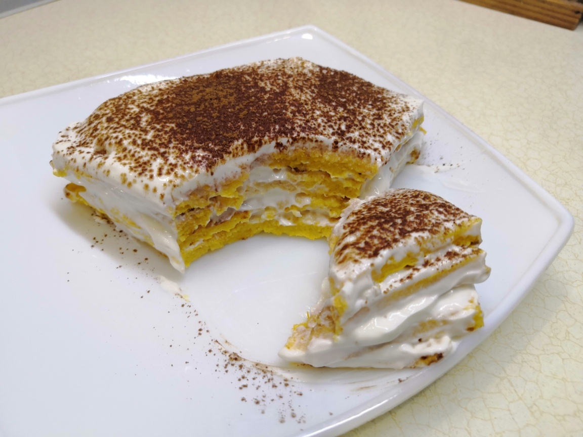 Тут не нужна ни духовка, ни микроволновка, пользуемся старой доброй сковородой. КБЖУ на все (без какао сверху) 311.7/21.3/13.0/34.5 Ингредиенты: 1. Тыкву очистить и натереть на мелкой терке. У меня сорт - баттернат, она сладкая и ароматная, я не использовала подсластитель в основу. Добавить к тыкве яйцо, разрыхлитель, муку и хорошо перемешать 2. Выложить массу на слегка смазанную маслом сковороду. Распределить ложкой по всему дну. Готовить на небольшом огне под крышкой с двух сторон 3. Блин остудить. Для крема смешать мягкий творог и подсластитель. Блин разрезать на 4 части и каждую смазать кремом. Я посыпала сверху какао. В холодильник для пропитки не ставила, тортик был нежным и вкусным.