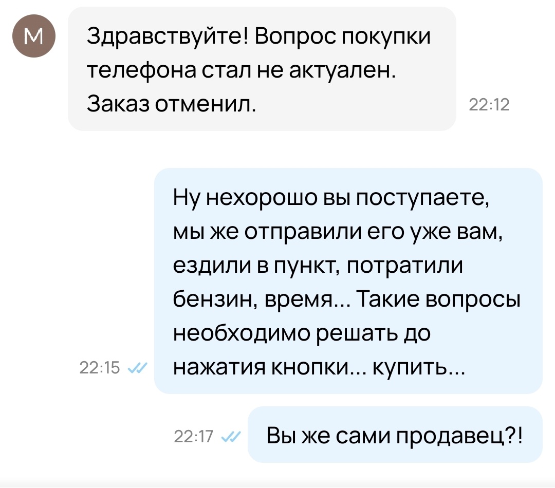 Вот так просто и лаконично) написал мне покупатель, который купил у меня телефон на Авито. Купил быстро, без всяких дополнительных вопросов. Но, написал на второй день после отправки телефона, как раз в пути следования только что наверное) из моего города.👇 То есть, он его даже и не получил. Наверное и слава богу, а то мало ли что наделал бы с ним, доказывай потом ходи. Я зашла на его профиль и увидела, что он и сам продавец, много продаёт товаров. А я как добросовестный продавец бегом побежала на Яндекс Доставку, чтобы быстрей отправить товар дорогому покупателю. Я так всегда делаю. Ну, во-первых, люди то ждут, хотят быстрей получить свою покупку. Да и мне хочется скорей отправить, выполнить свои обязательства перед покупателем и не затягивать. А отделение Яндекс Доставки не очень то и близко от моего дома, нужно ехать на машине. Я вот не понимаю, ну почему люди так по-свински поступают? Ну есть же время, тебя никто не заставляет быстрей совершить покупку. Посиди, подумай...
