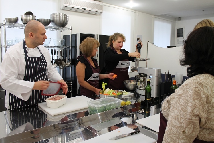 На заре мультиварочного бума одна фирма пригласила меня на мастер-класс. В то время мне, как победительнице кулинарного конкурса, предложили тестировать мультиварки, чем я некоторое время с удовольствием и занималась. И на мастер-классе по су-вид оказалась. До этого мероприятия я купила электрогриль этой фирмы, на мультиварочном форуме показывала и рассказывала, что и как на нём готовлю, а тут еще параллельно и мультиварки тестирую, в общем, меня заметили и пригласили. С этой фирмой у меня потом не срослось по не зависящим от меня причинам, но су-вид я научилась делать. Само мероприятие было для меня любопытное, и платила за него, к тому же, не я, то есть, мне бесплатно, что тоже хорошо. Я приценивалась потом в интернете к подобным мастер-классам, недешево, скажу я вам. Делюсь с вами впечатлениями. Красивая обстановка зала Стеллажи с оливковым маслом. Сколько разных сортов! Для начала в баре нас угощали хорошим кофе, соком и вином Разная бытовая техника не оставила меня равнодуш