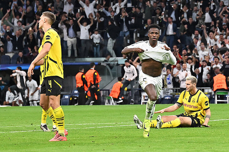 С «Ливерпулем» тоже блистал Винисиус. «Реал» умеет творить чудеса в любое время года – и не только в плей-офф. Камбэк с «Дортмундом» – уже в истории Лиги чемпионов. Просто вдумайтесь: это только второй случай в ЛЧ, когда команда, проигрывая в два мяча, выигрывает в три. И первым это тоже делал «Мадрид» – в 1/8 финала ЛЧ-2022/23 с «Ливерпулем». Тогда «Реал» пропустил дважды за 14 минут: Дарвин Нуньес шикарно подстроился и забил пяткой, а Тибо Куртуа сделал подарок Мо Салаху – очень быстрые 2:0 выглядели для «Ливерпуля» так приятно. Но «Мадрид» быстро очнулся – и тогда тоже сверкал Винисиус. Сначала положил в дальний из штрафной, потом воспользовался ошбкой Алиссона – вратари сравнялись по фэйлам. Второй тайм прошел идеально для «Реала»: Эдер Милитао забил победный, Карим Бензема уложил дубль за 12 минут. Пять голов на «Энфилде» подряд! За 40 с небольшим минут чистого игрового времени – так умеет только «Мадрид»! «Реал» тогда стал первой командой в истории, положившей пять хозяевам на «Э