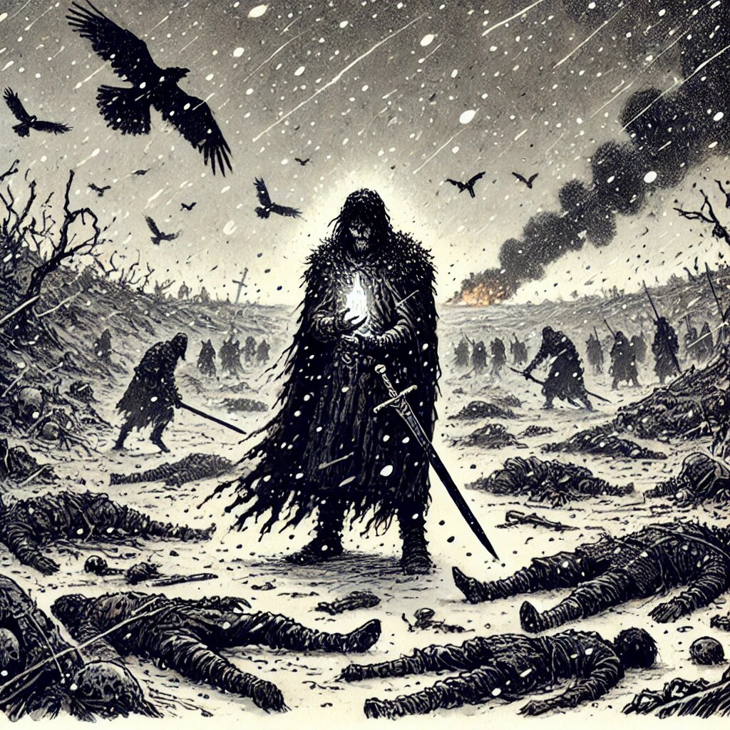 Небо сыпало снегом и пеплом, заставляя рябить ещё сильнее и без того серо-белый пейзаж. Люди, нелюди – все вперемешку, словно упившиеся вусмерть на хмельном пиру. Если не всматриваться, то можно не заметить деталей вроде оторванных рук, отрубленных лап, сломанных и вывернутых костей.