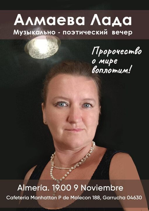 Дорогие русскоязычные альмерийские, а также андалузские и мурсианские ( не с Марса, а из провинции Мурсия) друзья! Открываем осенний сезон в нашем Доме литературы и искусств выступлением поэтессы Лады Алмаевой. Милости просим 9 ноября в кафе у самого синего моря в Гарруче( провинция Альмерия).В конце вечера – свободный микрофон. Каждый присутствующий и пишущий стихи или прозу сумеет рассказать о себе и почитать стихи или небольшие прозаически отрывки. Вход бесплатный. Вечер организован писателями Еленой Данченко и Анной Деминой.