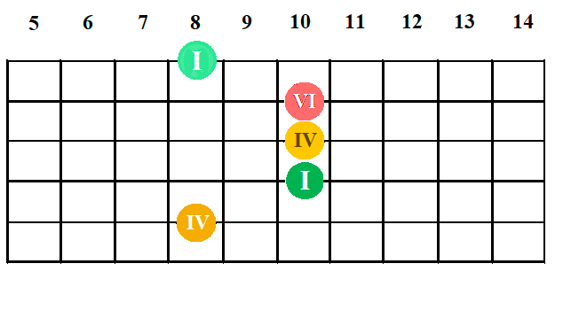 Басовая тоника следующего, субдоминантового аккорда, находится на 5-й струне (нота F, фа). Возвращаемся к цепочке и подбираем соответствующую форму аккорда. Это может быть либо форма С, либо форма А.