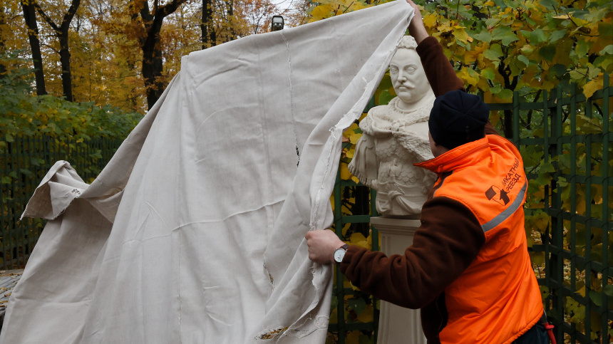 Скульптуры заботливо укрывают холстами и прячут в короба. Фото: ТАСС/ANATOLY MALTSEV; 5-tv.ru Один из заметных признаков приближения зимы в Петербурге. Скульптуры в Летнем саду сегодня начали готовить к морозам и снегопадам. Перед тем как упаковать, каждую из них обрабатывают от вредителей и грибков. Этот метод применяют уже примерно 200 лет. В советское время предлагали использовать стеклянные конструкции, чтобы изваяниями можно было любоваться в любое время года. Но от идеи быстро отказались. Выяснилось, что мрамору недостаточно воздуха, отчего он начинает чернеть. Добавлю, что не все скульптуры в Саду — подлинные, большинство — искусные копии. К оригиналам у реставраторов особо трепетное отношение. «Это скульптура, которую заказывал сам Петр в ознаменование победы в Северной войне… Это такой шедевр мировой. Зима у нас переменчивая и внутри этого, так сказать, футляра образовывается конденсат. Эта холщовая ткань впитывает в себя влагу и не дает попасть на скульптуру», — говорит Алекс