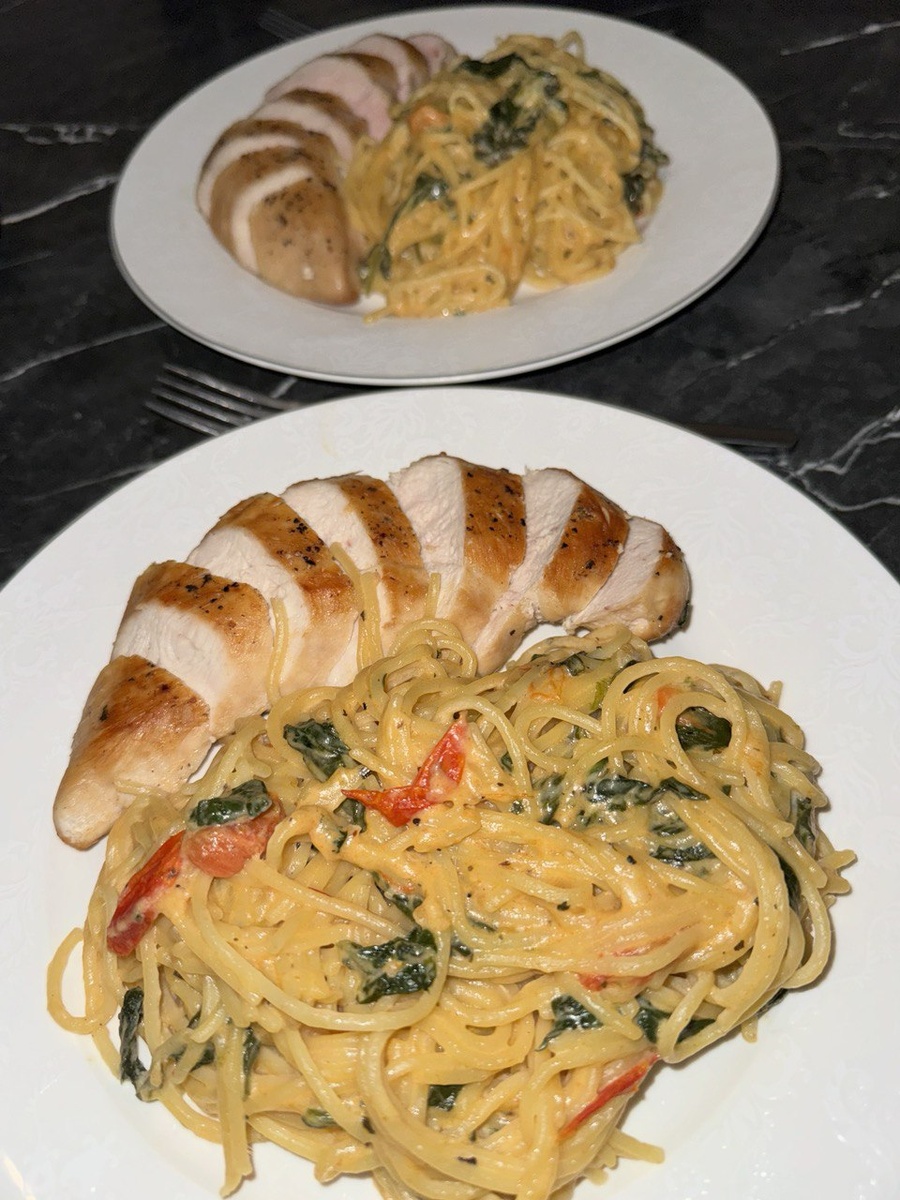 Рецепт куриной грудки с пастой, шпинатом и томатами в сливочном соусе: **Ингредиенты**: - Куриная грудка — 300 г - Паста ( Спагетти )— 250 г - Шпинат — 100 г - Помидоры черри — 200 г - Сливки (20%) — 200 мл - Лук — 1 шт. - Чеснок — 2 зубчика - Оливковое масло — 2 ст. л. - Пармезан — 50 г (по желанию) - Соль и перец — по вкусу **Приготовление**: 1. Отварите пасту в подсоленной воде до состояния аль денте и слейте воду. 2. Приготовьте курицу: Обжарьте куриную грудку на сковороде с оливковым маслом до золотистой корочки, примерно 5-7 минут с каждой стороны. 3. Добавьте лук и чеснок: Мелко нарежьте лук и чеснок, добавьте их к курице и готовьте еще 2–3 минуты. 4. Приготовьте соус: В сковороду добавьте разрезанные пополам помидоры черри и шпинат. Жарьте, пока шпинат не станет мягким. Затем влейте сливки, приправьте солью и перцем. Дайте соусу загустеть на среднем огне, около 5 минут. 5. Смешайте с пастой: Добавьте пасту в сковороду с соусом. Тщательно перемешайте, чтобы паста пок