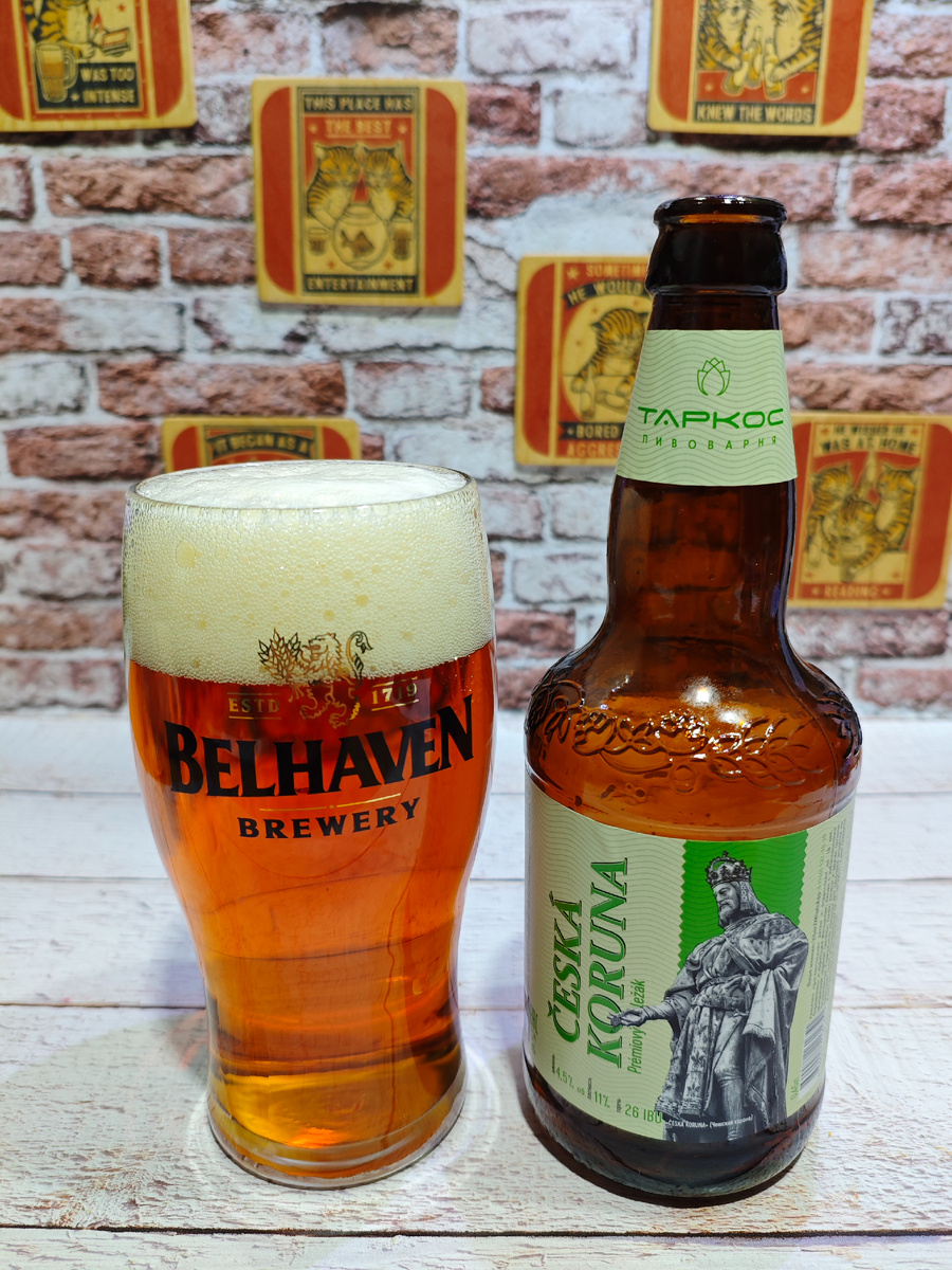Пиво светлое фильтрованное пастеризованное "Чешская корона" от воронежской пивоварни Таркос (ООО "Пивоварня"). ********************************************************************************** На своём сайте пивовары рассказывают следующее: "«Чешская корона» — пиво с узнаваемым чешским характером. Оно сварено с использованием светлого солода и специально подготовленной воды — такой же, как в Чехии. Светлый солод придает пиву насыщенный вкус и сладковатый зерновой аромат. Хмели завершают вкусоароматический букет пива, добавляя легкую, но заметную горчинку и травянисто-пряные ноты." ********************************************************************************** Плотность: 11%. Горечь: 26. Состав: вода подготовленная (исправленная), солод пивоваренный ячменный, хмель. Срок годности: 270 суток при температуре хранения от 0℃ до +20℃. С даты розлива моей бутылки прошло 2 месяца. ********************************************************************************** Пена пышная, но стойкостью