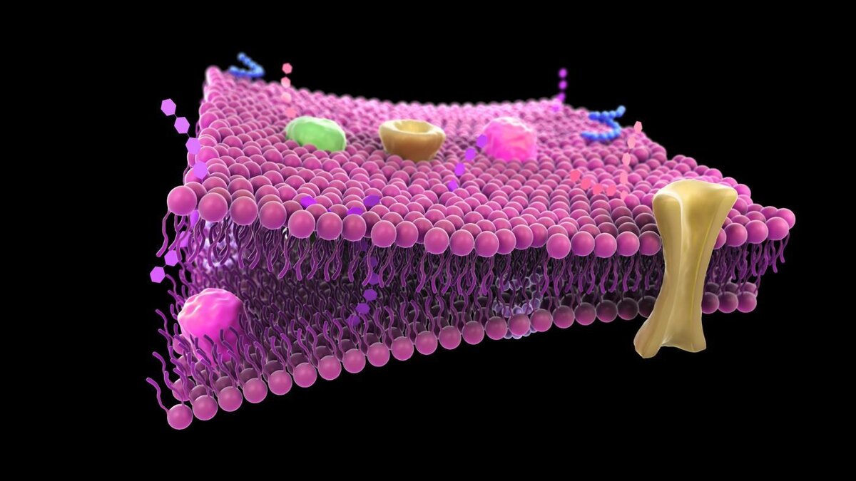 Клеточная мембрана — это тонкая, полупроницаемая оболочка, окружающая клетку и отделяющая её содержимое от внешней среды. Она играет ключевую роль в поддержании гомеостаза и выполнении различных функций. 1. Липидный бислой: Основу мембраны составляют фосфолипиды, молекулы которых имеют гидрофильную (водорастворимую) "головку" и гидрофобные (водоотталкивающие) "хвосты". Фосфолипиды выстраиваются в двойной слой, где "головки" обращены наружу, а "хвосты" — внутрь. 2. Белки: В мембране расположены интегральные (проходят через всю мембрану) и периферические (прикреплены к её поверхности) белки. Они выполняют функции рецепторов, транспортёров, ферментов и других. 3. Углеводы: Часто прикреплены к белкам или липидам, образуя гликопротеины и гликолипиды. Углеводы участвуют в клеточной идентификации и межклеточной коммуникации. 4. Холестерин: Встраивается между фосфолипидами и стабилизирует мембрану, придавая ей прочность и гибкость. 1. Регуляция проницаемости: Мембрана контролирует, какие вещес