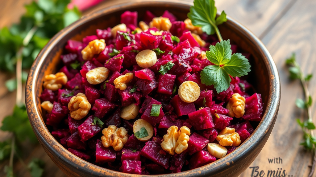 Просто натрите свеклу. Вместо надоевшего винегрета готовлю улетный салат за 5 минут: век живи — век учись Свекла — это тот продукт, который иногда остаётся в тени более популярных овощей, таких как картошка или морковь. Но поверить не могу, как долго она ждет своего часа! Теперь пришёл момент воскресить её в вашем рационе, и я предлагаю вам попробовать один из самых простых и вкусных рецептов свекольного салата — всего за 5 минут. Начнём с того, что для этого рецепта вам понадобится всего три основных ингредиента: свекла, чеснок и немного орехов. Почему свекла? Да потому что это один из самых универсальных корнеплодов, который отлично хранится в холодильнике и насыщен витаминами. Кроме того, она помогает организму, не только обогащая нас полезными веществами, но и даря нам необходимую энергию. Итак, начнём с самой главной героини — свеклы. Приобретите ее на ближайшем рынке, если есть возможность. В наше время свежие и местные продукты становятся все более актуальными. Чем меньше времен