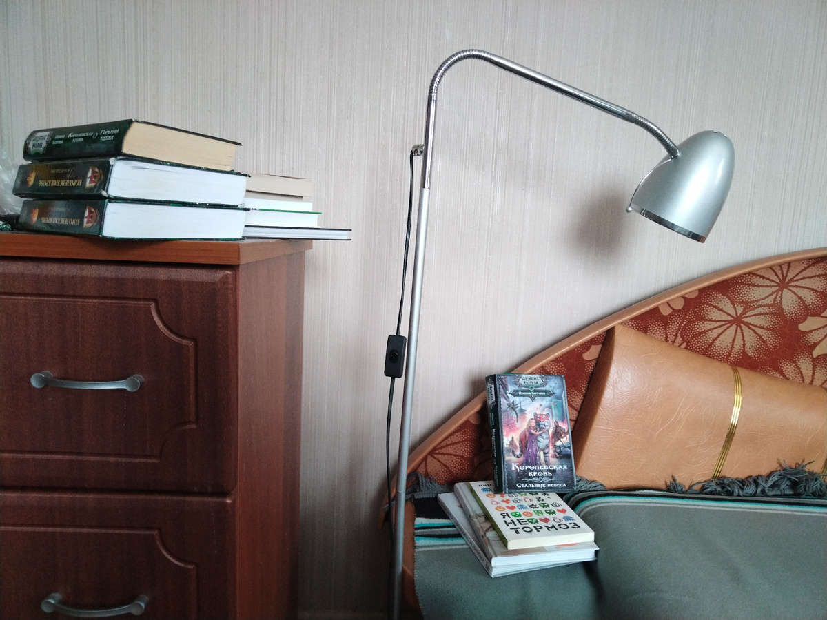 Чаще всего читаю книги на ночь. С моей стороны кровати стоит комод, заваленный книгами и светильник на длинной ножке. Я люблю читать ночью, когда все спят, и ни кто меня не отвлекает. Иногда прихожу с чашкой чая и какой ни будь вкусняшкой, включаю светильник, залезаю под одеяло и забываю про время, особенно если на следующий день будет выходной, и можно по спать по дольше.