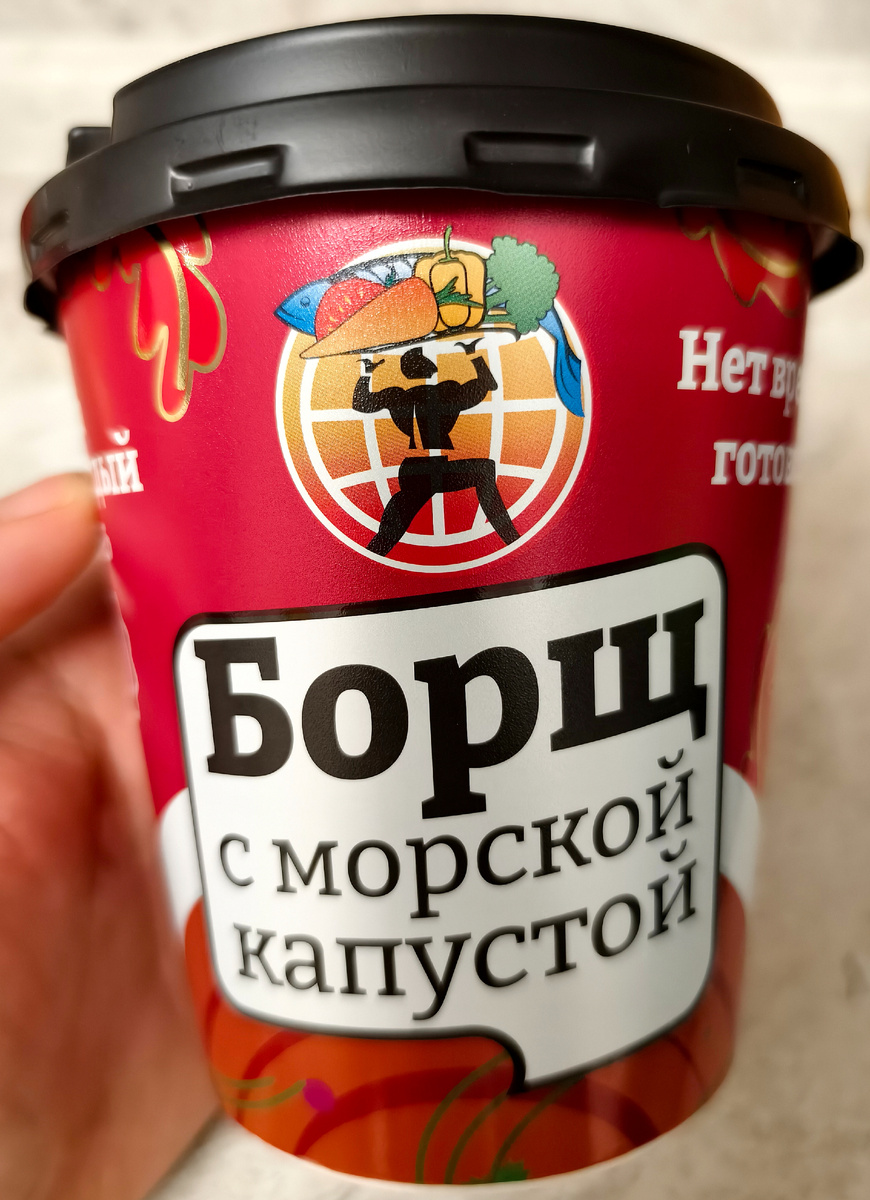 Всем привет! Сегодня буду пробовать борщ с морской капустой. Интересный вариант супа. Когда-то давно я пробовал дальневосточные щи с морской капустой и как-то мне не очень понравилось. Я больше привык к щас с обычной капустой, а на Дальнем Востоке это распространенное блюдо. Купил такой борщец на маркетплейсе за 178 рублей. Здесь даже предусмотрели дополнительное использование крышки). В нее можно вставить телефон и посмотреть какой-нибудь сериальчик при употреблении борща. Изготовитель: ООО "Рыбный день", Приморский край, г. Артем. Способ приготовления классический. Калорийность невысокая, особо им не наешься. Масса всего 37 граммов. Зато какой большой стакан). Основным ингредиентом в составе являются морские водоросли ундария перистая, более известная как водоросль вакамэ. Из нее также делают салат чука. Состав достаточно длинный, но я не заметил самого главного ингредиента для борща - свёклы. Ну как я считаю, что чего-то в борще может и не быть, а свёкла обязательная составля
