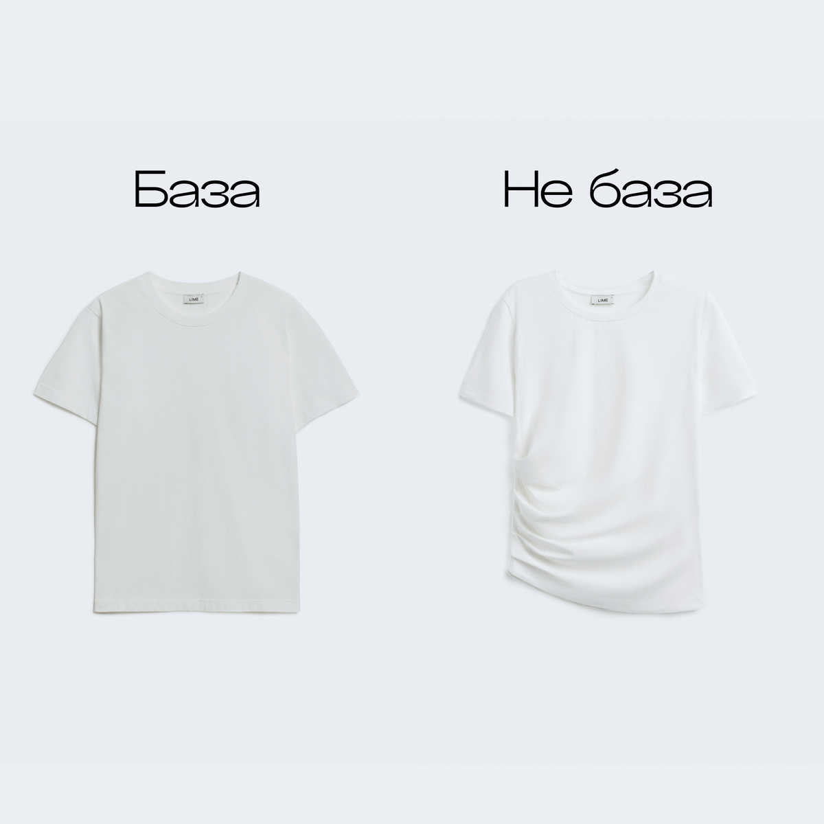 Обе футболки на первый взгляд кажутся одинаковыми: обе белые, простого кроя, без принтов. Но почему же правая не считается базовой? Всё дело в драпировке — этот акцент, на первый взгляд, выглядит незначительно и даже привлекательно. Кажется логичным выбрать более интересную вещь, чем классическую скучную футболку. Однако это может стать ошибкой. Драпировка усложняет сочетание — такую футболку уже не получится использовать как первый слой под пиджак или жакет, и к ней сложно добавить другие акцентные элементы. Более того, через год она может выйти из моды, превратившись в «мертвый груз» в вашем шкафу, в то время как простая базовая футболка останется актуальной ещё долгое время и будет сочетаться практически с любыми вещами.