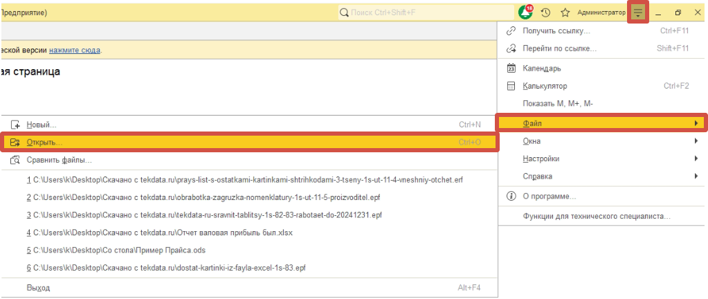 Загрузить обработку в программу 1С можно через Файл – Открыть: