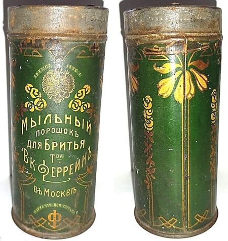 Баночка для мыльного порошка для бритья Товарищества "В.К. Феррейн". Владимир Карлович Феррейн, немец, магистр фармации, получил в управление аптечное дело отца Карла Ивановича Феррейна. Это была Старо-Никольская аптека на Никольской улице в Москве. В 1873 Владимир занял деньги для выкупа соседнего здания под дополнительные торговые площади и склад. Через 20 лет он добился разрешения на перестройку своего аптечного комплекса. Новая аптека была открыта в 1899 году. Она была самая большой и роскошной в Европе. В мае 1915 во время антинемецких волнений аптека была разгромлена. Первым делом были выпиты все запасы спирта. Квартиру хозяина сожгли. Когда пришли большевики, Владимир Карлович перебрался в Крым, где в 1918 и скончался в возрасте 84 лет. В СССР аптека на Никольской сначала называлась "Центральной", потом стала "Аптекой № 1". У Феррейна было еще две аптеки, на Арбате и на Тверской. Усадьба Феррейна в Бутово вместе с ботаническим садом и плантациями лекарственных растений в 1931 го