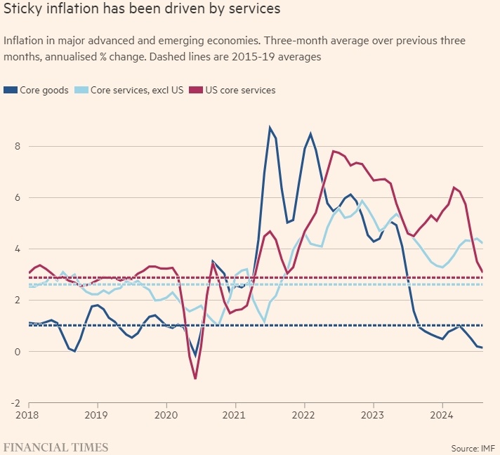 В докладе подчёркивается, что инфляция в сфере услуг остаётся высокой, особенно в развитых и развивающихся странах, за исключением США.
