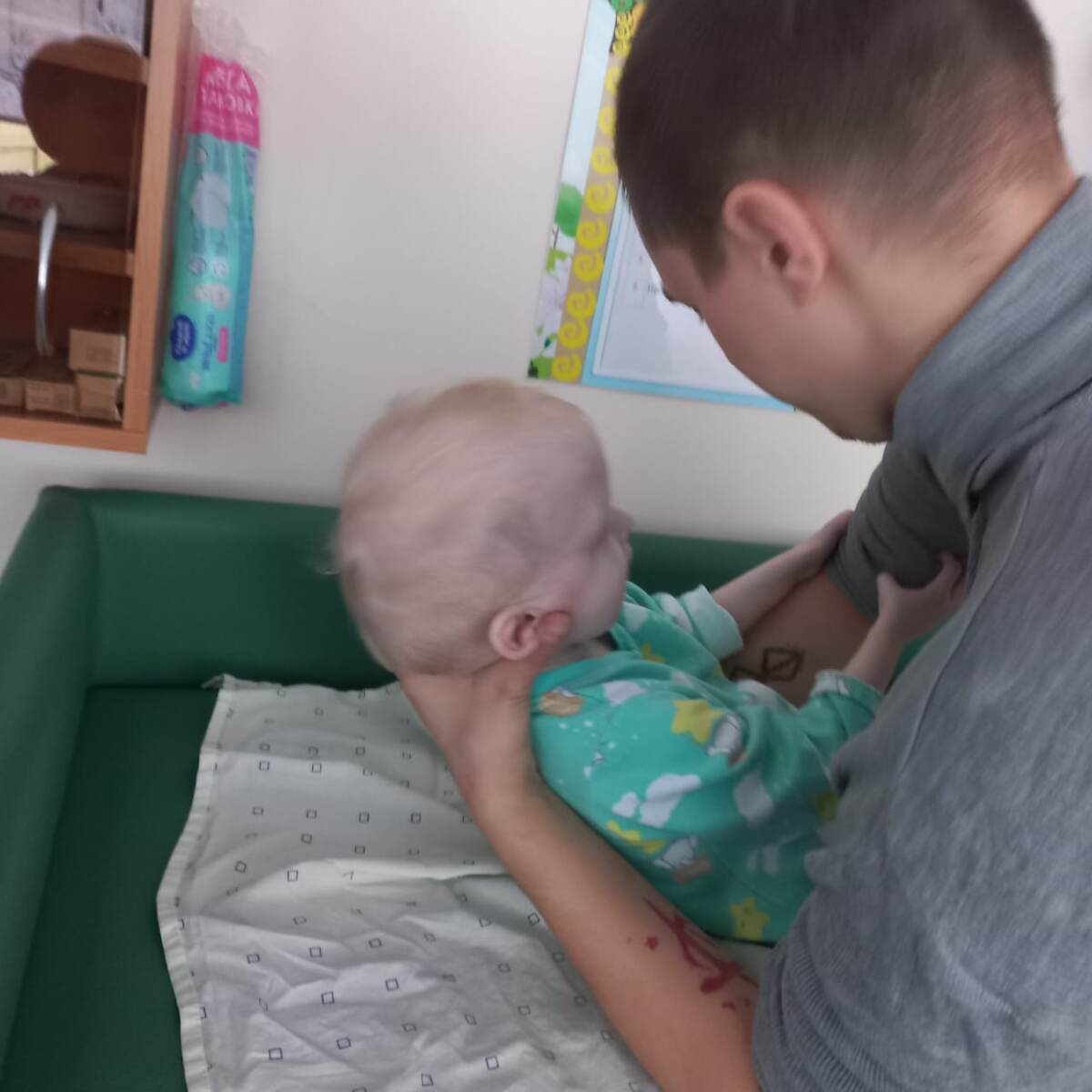 Наши специалисты и волонтёры регулярно занимаются с детьми с инвалидностью из дома ребёнка, и это даёт результаты. Например, постоянно с ними проводит занятия наш инструктор ЛФК Александр. Он делает массаж, суставную гимнастику, учит переворачиваться на бок.