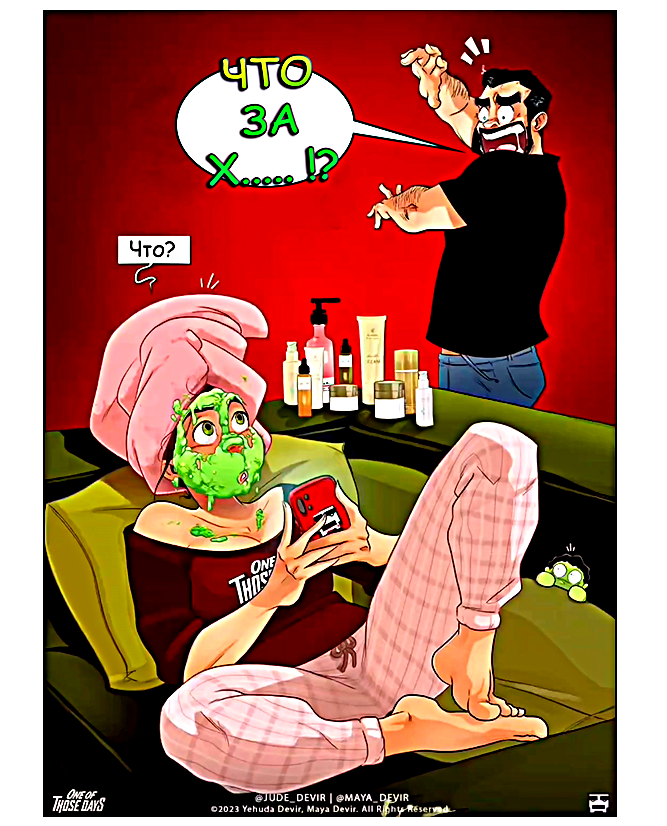 Семья иллюстраторов из Израиля уже больше 5-ти лет радует своих фанатов яркими и эмоциональными работами. Они вдохновляются бытовыми ситуациями, а потом делают наброски для комиксов. Иегуда Девир - признанный мастер своего дела, рисует себя, супругу Майю и деток Итана и Ариэль, в забавных ситуациях. Среди множества художников - семьянинов, его творчество легко узнаваемо. А сюжеты он всегда старается отыскать новые, подмечая мельчайшие детали. Глядя на эти юморные скетчи невольно представляешь своих родных или знакомых. Эти истории понятны зрителям разных стран, ведь ситуации показанные в них - актуальны всегда. Сегодняшняя подборка содержит как новые, так и полюбившиеся зрителям комиксы. Когда женщина примеряет одежду, которая уже стала "немного" мала, её мужу лучше сделать вид, что всё в порядке. Зачем обижать её чувства? Почувствует неудобства - поймёт всё сама. Иегуда всегда рисует любимую супругу фигуристой. Чтобы не было таких ситуаций, нужно правильно подобрать форму для посещен