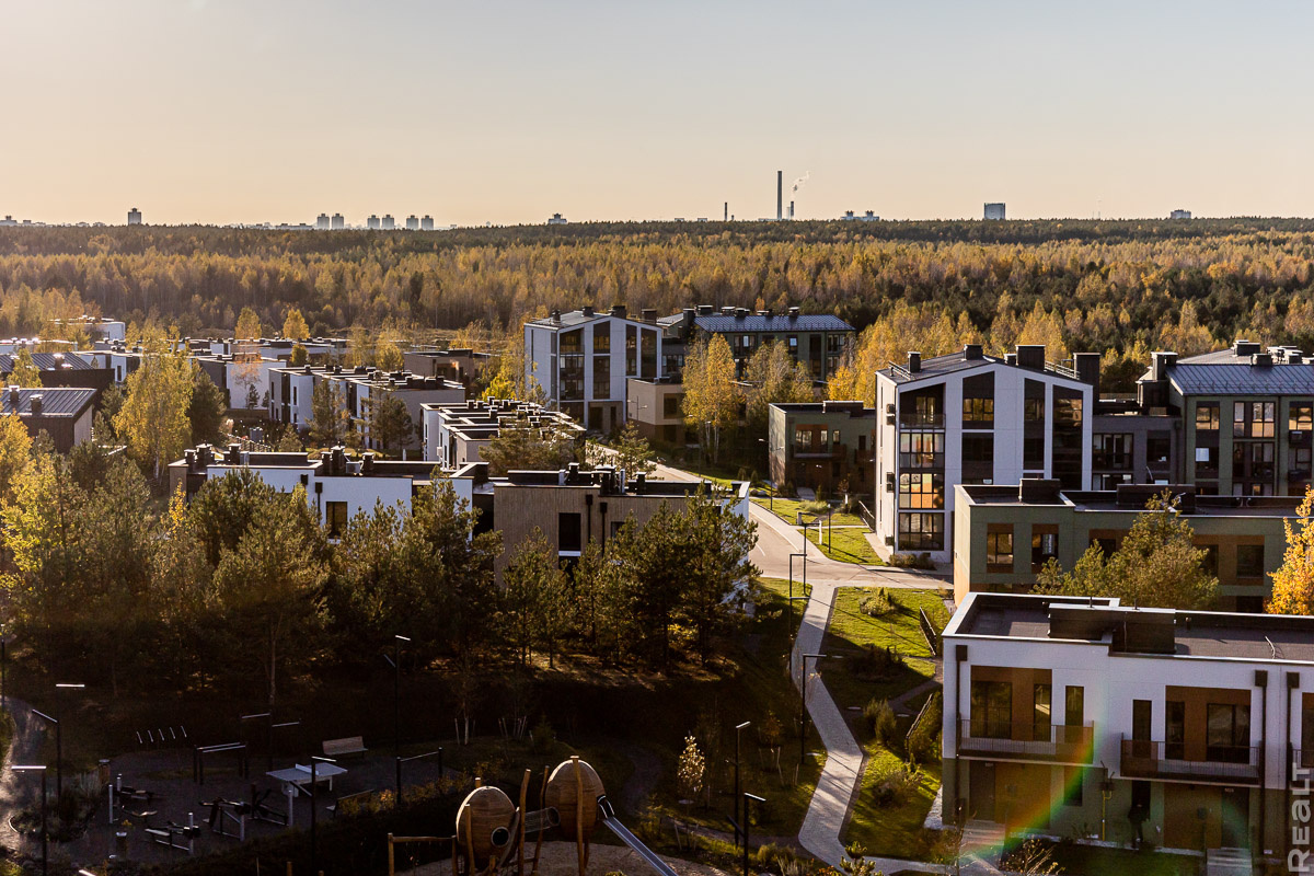 Золотая осень превратила этот репортаж в настоящую сказку. Закатный свет подчеркивал яркие краски листвы и отражался в окнах новостроек. Строительные краны вдалеке сливались с высокими деревьями, поэтому мы не сразу их замечали, лишь когда Игорь — сотрудник отдела продаж Зеленой гавани — рассказывал о новых объектах, которые появятся тут в ближайшие три года.