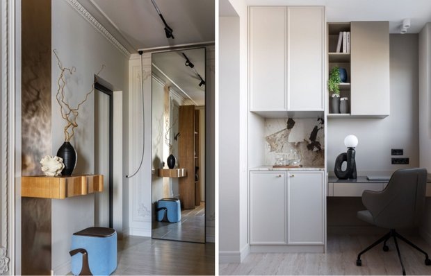 Классные дизайн-решения для вашего интерьера Дизайнер Ксения Степаненко полностью переделала интерьер стандартной двушки и превратила ее в стильную и функциональную трешку 94 кв. м. Продуманные системы шкафов, красивые стеллажи и тумбы — места для хранения ловко растворяются в пространстве или наоборот — становятся его визуальной доминантой. Собрали крутые идеи, которые достойны вашего внимания. Часть кухонного гарнитура вынесли на балкон. Это сделали намеренно, чтобы скрыть мелкие бытовый приборы и организовать своеобразный мини-бар в кабинете. Хранение в детской комнате организовали во встроенном шкафу длиной 2,5 метра. За глухими фасадами предусмотрено хранение одежды, за красивыми дверцами со стеклянными арками — хранение игрушек. В нижних выдвижных ящиках тоже находятся игрушки и настольные игры. Ящики полностью выкатываются из секций, что очень удобно для детей. Стеллаж в гостиной выполнен на заказ. Он имеет скругленные элементы и визуально тонкие полочки. Стеллаж сделали из того