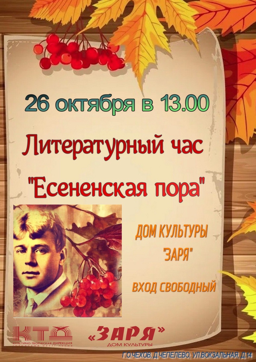💥 Жителей и гостей городского округа Чехов приглашаем на литературный час 26 октября в 13.00 пройдёт Литературный час "Есененская пора" 📶 Категория: Встречи 🚫 Возраст: 0+ 📆 26.10.2024 🕕 13:00 🏢 ДК «Заря» 📍 г.о. Чехов, д. Чепелево, ул. Вокзальная, д.14 🪙 Стоимость билетов - Бесплатно❗️ #КТД #ГоспабликиМО #ГородскойОкругЧехов #ДКЗаря #Чепелево