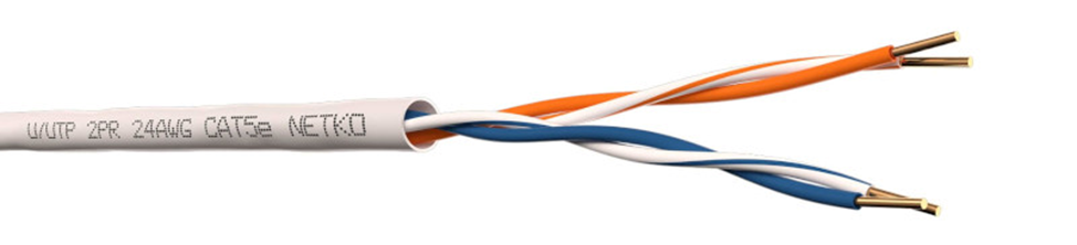 Чаще всего применяется четырёхпарная витая пара (4PR). Тем не менее, кабель на 2 пары тоже используется, но в определённых случаях. Объясним конструкцию двухпарного кабеля и приведём примеры использования витой пары из четырёх жил. Двухпарный кабель изготавливается по тому же принципу, что и четырёхпарный. Четыре жилы, покрытые изоляционным слоем, попарно свиваются в «косички». Затем эти две «косички» свиваются между собой. Как и 8-жильная витая пара, двухпарка тоже может быть с экраном или без. Пример экранированной модели российского производства: Двухпарная витая пара тоже представлена в нескольких категориях, но не выше 5е. Категория 2 сегодня почти не встречается в телефонных сетях, чаще там используют витую пару 3 категории. В компьютерных сетях применяют двухпарную витую пару категории 5е. Пятая категория эффективна как для домашних локальных сетей, так и для офисных компьютерных систем. Даже у двухпарной витой пары есть разные варианты внешних оболочек. Помимо обычной серой из