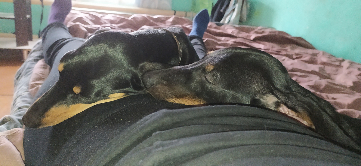 За окном осенний промозглый день. Серо и безлико. На душе в такие дни пустота, грусть и опатия. Я дома одна, дети ушли в школу, дома тихо и темно.... И если бы не они я бы впала в депрессию. Мои таксы- моя семья! Щенки не дадут сойти с ума от тишины, то грызут что то, то топают как слоники, то рычат играя между собой. А более взрослые в этот момент согревают душу лёжа на мне Когда я так лежу, особенно с Диной самой старшей я чувствую полную синхронизацию, мы на одной волне. Как будто одного возраста, она знает, что мне нужен покой и ей тоже уже не до бешеных игр. Соня тоже умеет подстраиваться. Когда играть тогда играть, когда лежать и о чём-то думать, то лежать и думать. Также обнимая их чувствую нужное тепло в такой день. Конечно собачник так может с любой породой, ведь Ваш пёс любимый, но для меня удобней таксы нет! 1) Я не могу даже представить как бы на мне лежал большой лохматый зверь, всё же издавая "аромат" Своей шерсти. 2) также если бы это был гладкошерстный , н
