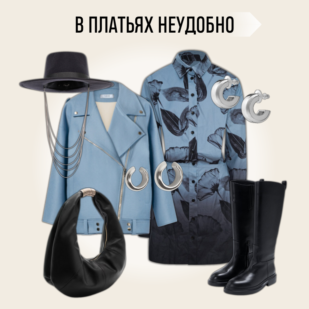 Платье👗 – само по себе уже почти образ: не нужно стыковать верха с низами, надела – и пошла. ⠀ Проблем две: неудобно😓 и скучно🥱 ⠀ 😓Неудобно – потому что колготки, обувь, высота, длина, пальто – как это все разнести и выстроить? ⠀ 🗝Лайфхак: ⠀ 🦵🏻колготки – либо в тон ноги, либо в тон платья, либо их не видно вообще – когда обувь заходит под подол платья. ⠀ 🧥пальто – длиннее платья. Есть нюансы, но это уже сложно, а мы упрощаем. 👠обувь – по силуэту идеально – до щиколотки или открывающая ее. А для тепла – пусть голенище заходит под подол. То есть, с мини – ботфорты, с макси – да что хотите. 🥿каблук – к платьям не обязательно. Если платье объемное и «тяжеловато», попробуйте к нему обувь с острым носом, можно на небольшом каблуке. А вот к легким струящимся платьям обувь, чем массивнее, тем лучше. ⠀ 🥱А скучно бывает, потому что «надела и пошла». Ну, в крайнем случае, пиджак накинула. И все – как еще стилизовать? ⠀ Когда платье позволяет, пробуйте что-то поверх него – пиджа