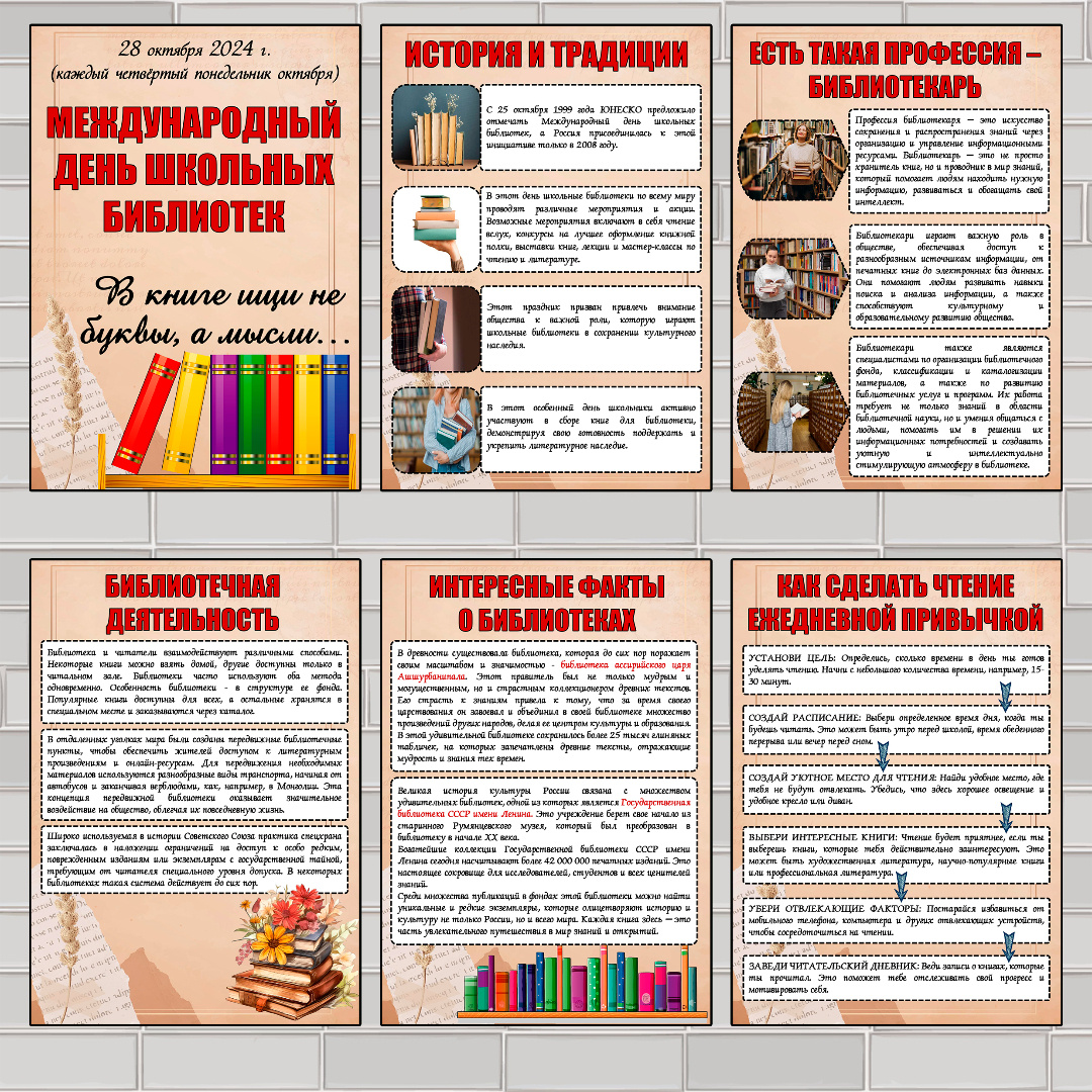 В наборе: 6 листов А4. https://infourok.ru/magazin-materialov/informacionnye-listy-mezhdunarodnyj-den-shkolnyh-bibliotek-28-oktyabrya-429983 Хотите разнообразить свои уроки или праздничные мероприятия? Присоединяйтесь к сообществу VK - Уроки Легко | Рабочие листы и шаблоны для печати - и не упустите возможность обновить свой арсенал шаблонов!