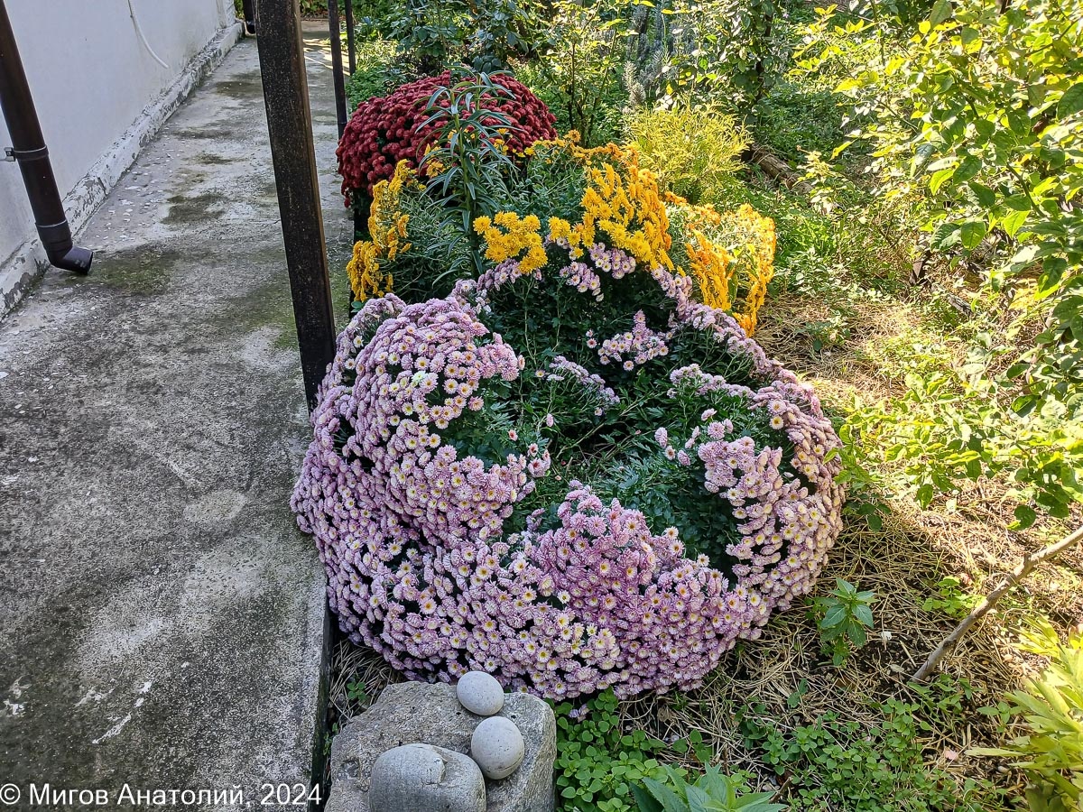 Хризантемы развалились. 10 дней нас дома не было, цветы остались без присмотра. А ещё в это время в Старом Крыму были ливни с грозами. Вот хризантемы и не удержали форму. Красная только молодцом, почти не уступила напору стихии. А больше всех пострадала жёлтая. Совсем расквасилась. А какой бодрой она была, когда мы уезжали в санаторий. Это я за час до отъезда сфотографировался с ней в обнимку. Хризантемам ещё цвести и цвести. Если в ноябре морозы не стукнут, то они ещё и в декабре будут нас радовать. Так что я решил исправить ситуацию. Набрал десяток подпорок, взял топор, чтобы подгонять высоту по месту, ну а Тильда сама пришла, чтобы поддержать меня морально, её упрашивать не надо. Приподнимал упавшие побеги и ставил под них подпорку. Так прошел по кругу желтого и сиреневого кустов. А красный трогать не стал, он и сам справляется. Получилось не хуже, чем было раньше. Попросил Тильду посидеть рядом, чтобы были понятны размеры кустов. Они впечатляющие. Два куста из трёх - красный и сире