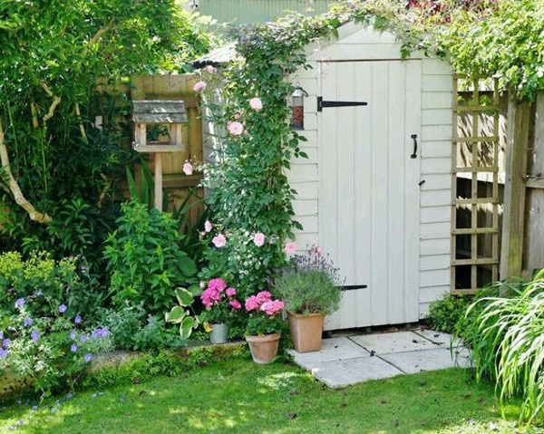 Даже симпатичный опрятный сарайчик для садового инвентаря хочется как-то вписать в окружающую действительность и немного "причесать". Вьющиеся растения, кусты, многолетники и цветы в горшках помогут в этом.
