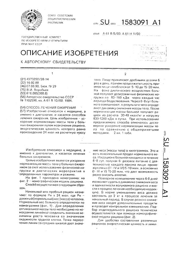 Вкратце, в чем суть разработки Воробьева. Его исследование направлено на ускорение нормализации массы тела путем снижения энергетической ценности суточного рациона до 24Ккал на кг массы тела. На фоне диетического воздействия нагружать тело дозированными физическими нагрузками по 80-160 кДж через каждый час периода бодрствования. После нормализации массы можно будет получать суточный рацион из расчета 30-40 Ккал/кг и нагрузку 630-1260кДж.