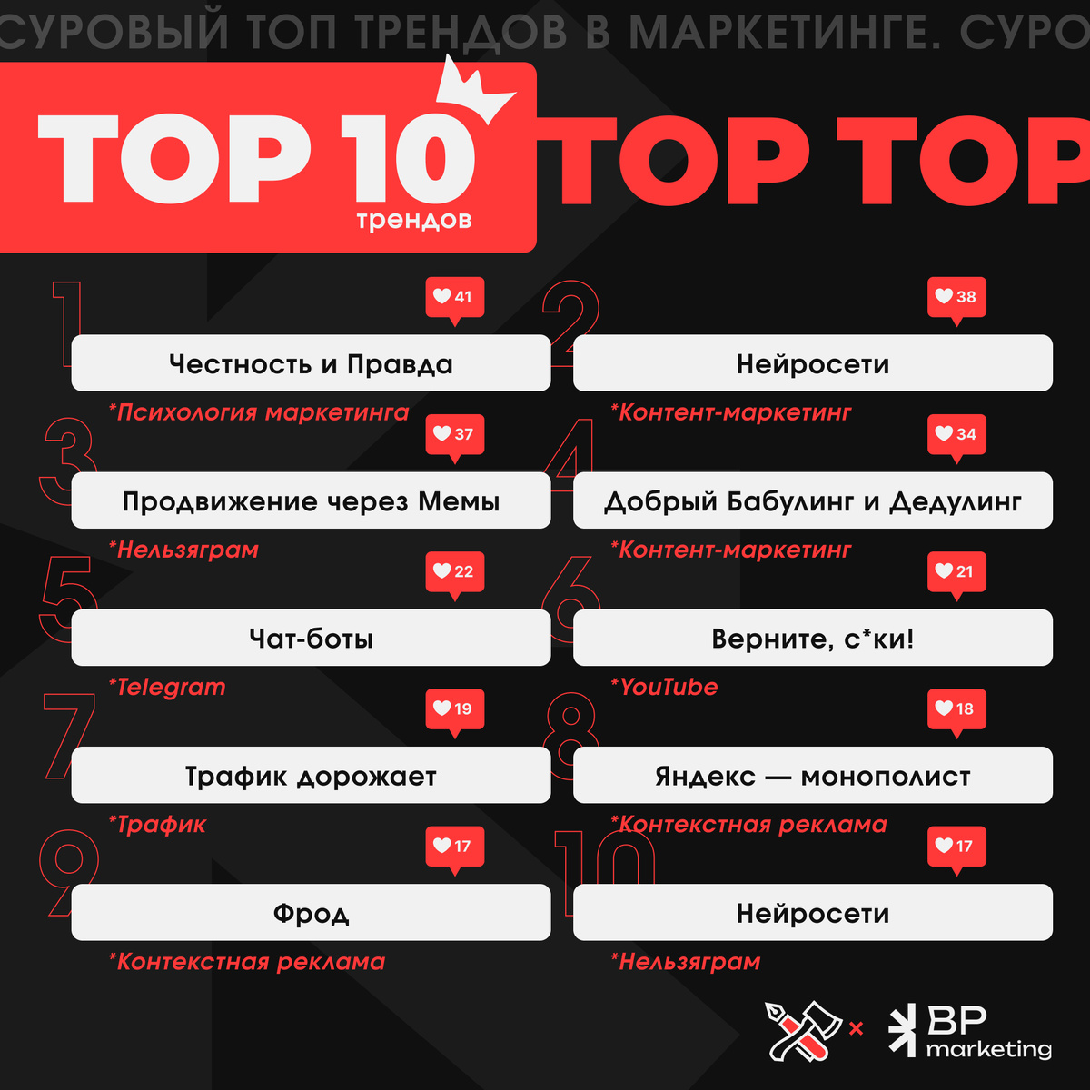 Неделю назад меня пригласили на Суровый Питерский Форум. Суровый — крупнейшее событие в мире digital-маркетинга. На площадке конференции собирается вся индустрия: руководители и сотрудники агентств, маркетологи, блогеры, подкастеры, проджект-менеджеры, разработчики, фрилансеры, СЕО и руководители крупного, среднего и малого бизнеса. Я на Суровом отвечал за стенд Трендов. И в рамках этого стенда я устроил большое живое исследование по «народным» трендам. Как это работало? Мы сделали большую доску, на которую каждый участник форума мог предложить свой тренд. И поддержать несколько трендов других участников своим голосом. В общей сложности было предложено 168 трендов в 19 категориях. А проанализировано было 789 голосов. Обычно тренды пишет какой-то один человек или команда со схожими взглядами. Здесь же мы получили настоящие «народные» тренды, которые видит и поддерживает целое сообщество маркетологов. За них отдали больше всего голосов участники форума. Непременно радует, что ТОП-1 Тре