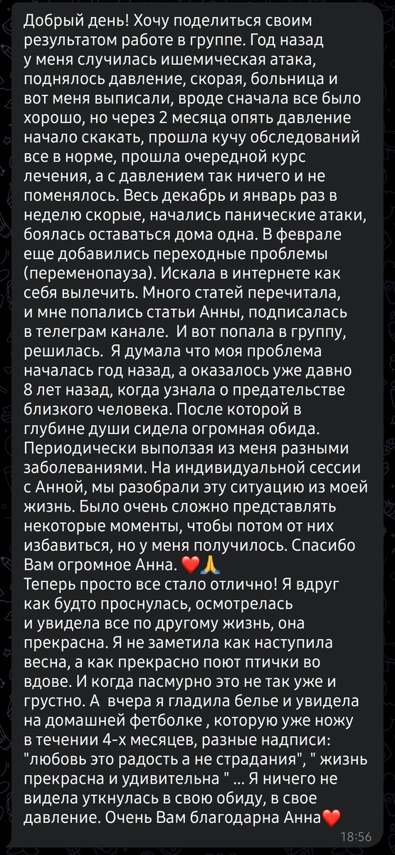 Вот один из ярких примеров, как можно быстро разблокировать и убрать негативные эмоции обиды и раскрыть сердце для любви. Вместе с обидой и страхом исчезли скачки давления, вернулась любовь и радость жизни. Отзыв моей пациентки