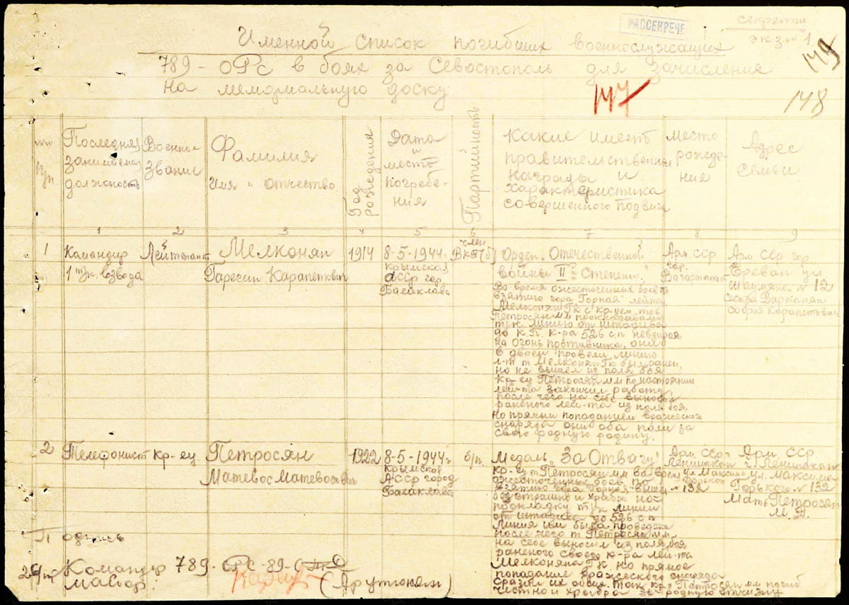 Во время изучения второго документа, появились дополнительные данные на сотни связистов, которые воевали, погибли или же пропали без вести на Керченском п-ове в 1942 году. Сведения, касающиеся армян, также приведены в данном материале, в конце основного текста с алфавитом.